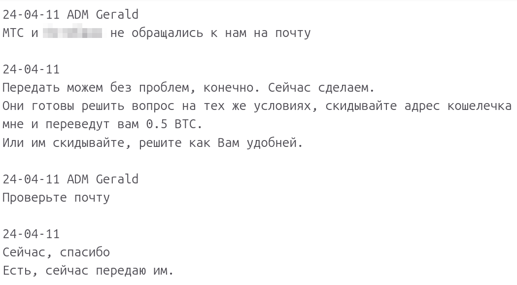 После установления личности одного из администраторов, мы вышли с ним на контакт, и он согласился сотрудничать и предоставлять всю внутреннюю информацию из рабочих чатов менеджмента проекта “Платежный Щит”. Благодаря этому получилось установить аккаунты ключевых лиц, которые являлись владельцами и администраторами проекта, а также их преступные цели и планы.