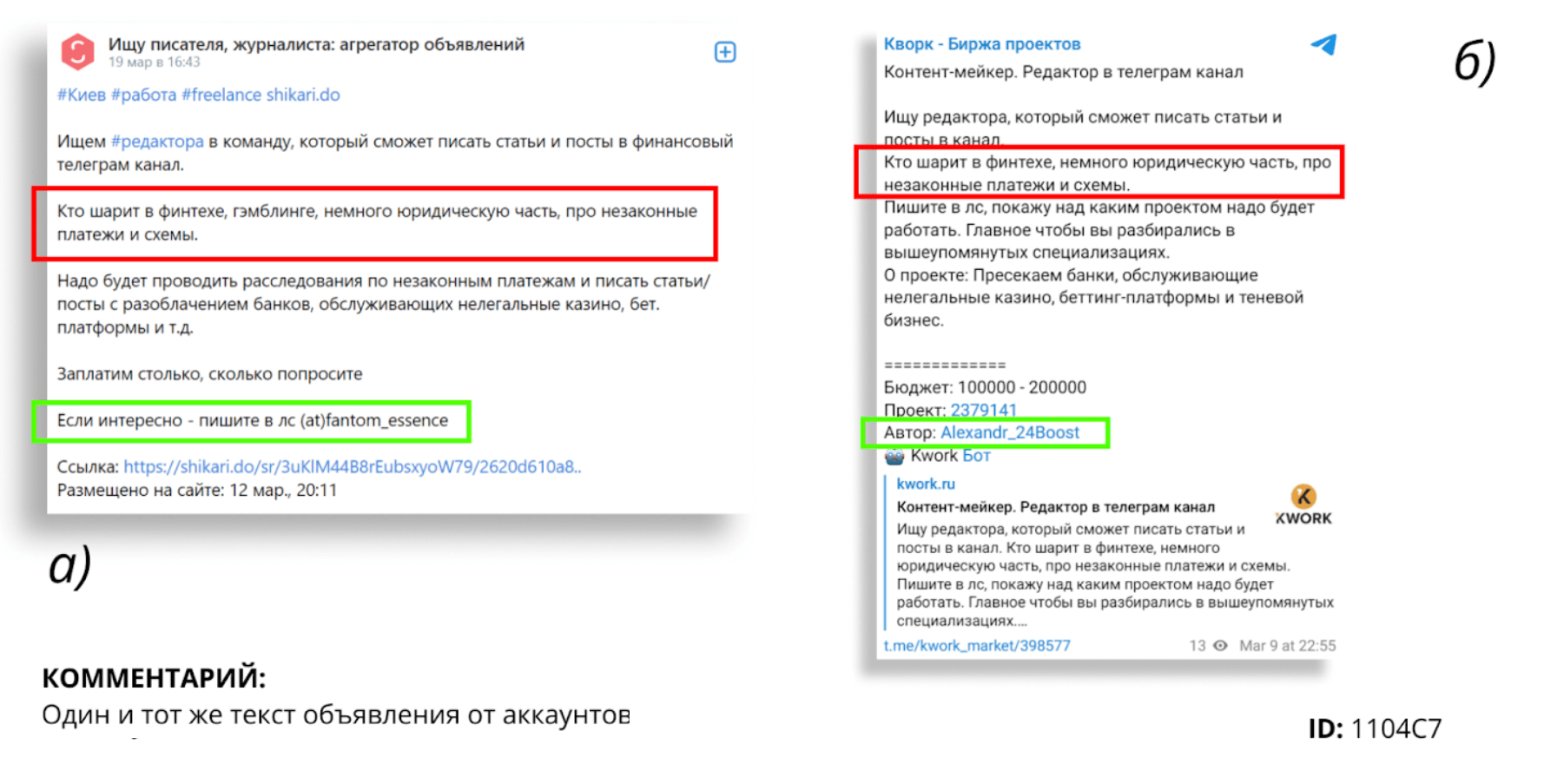 Ну и дополнительно хотим отметить, что Дмитрий Артюхов — глубоко паттернизированный человек. Это можно отследить, сравнивая псевдонимы в сети самого Артюхова, которые он использовал в разное время, и создателя канала “Платежный Щит” Геральда, например, во время набора людей в команду тг-канала на darknet-форумах. Приглашаем сравнить: