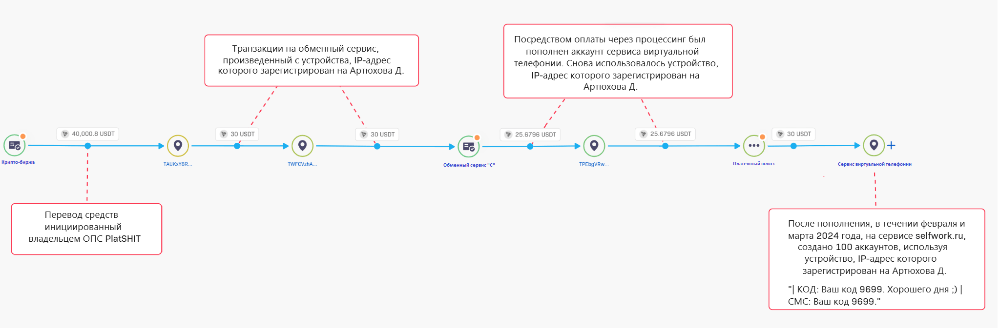 показал, что средства от данной транзакции были направлены на адрес, использующийся в том числе для дальнейшего обмена на USDT с аналогичным набором технических параметров и на этом же обменном сервисе, а именно: