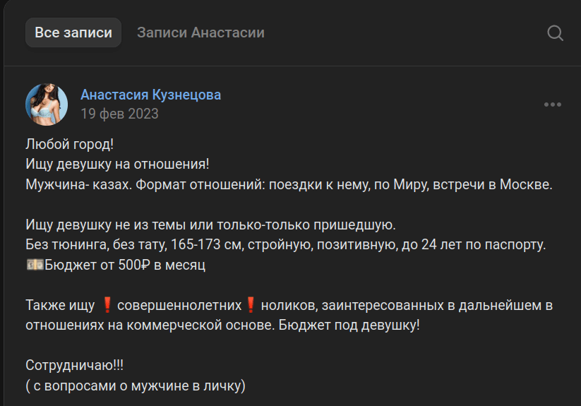 До знакомства с Лукьянченко, Карина пользовалась мобильным номером телефона +79260399471, на который была привязана страница в социальной сети VK (https://vk.com/id195259260), в которой Карина под вымышленным именем Анастасия Кузнецова проводила набор девушек для эскорт услуг: