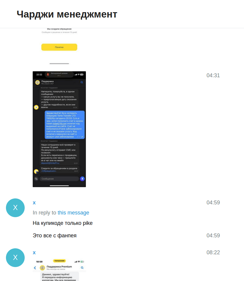 Например, был отмечен целевой «чардж» от «Платежного щита» по терминалам воронежской компании «Томе» на площадках Фанпэй, Купикод и др. Для этого нужно будет показать немного внутренней переписки проекта. Напоминаем что один из участников этого проекта охотно делился внутренней информацией.