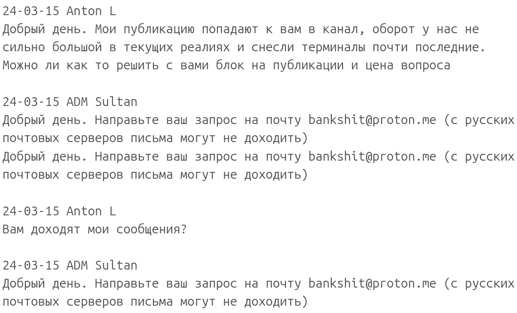 Что значит “мои публикацию к вам в канал”? В марте 2024 года публичная деятельность «Платежного щита» была минимальной. Как видно, на сообщение приходит автоматический ответ от администратора с ником Sultan, который просит общаться на почту сервиса Protonmail. Сообщения от Антона выглядят как тестирование работы того самого автоматического ответа, проверяя будут ли дублироваться ему сообщения, после чего автоматический ответ в боте Щита отключили. Так ли это на самом деле, или у вас есть другие предположения?