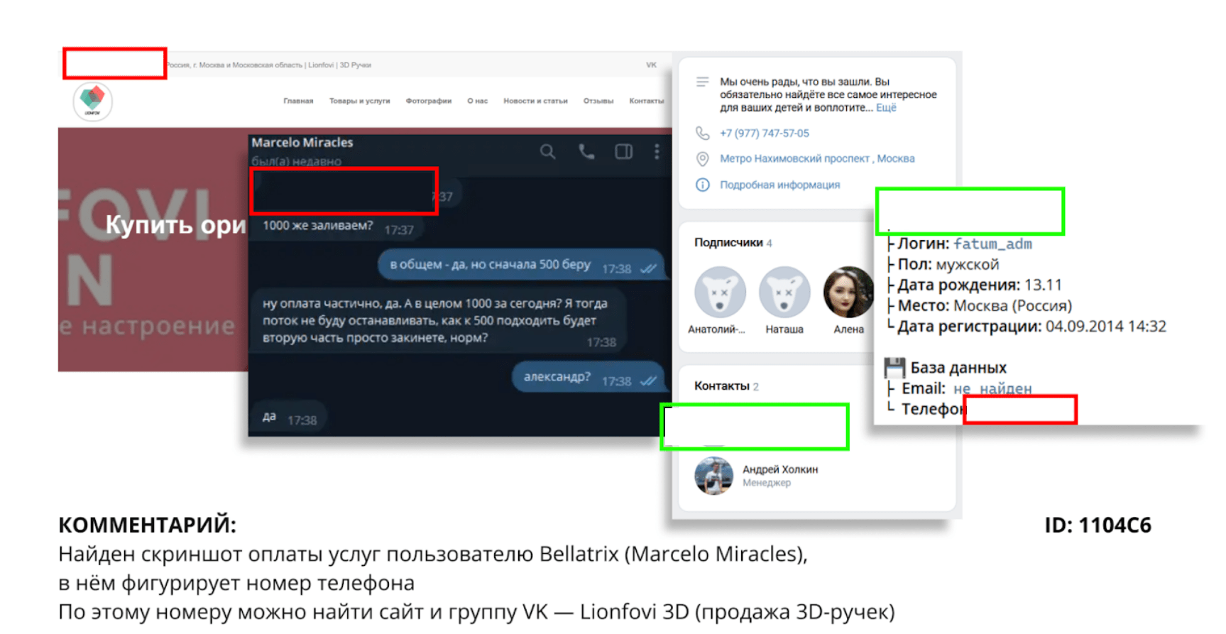 Анализ тем, которые открывал пользователь Bellatrix на форуме, позволил выявить номер телефона +79**460**26. На него Bellatrix получал оплату за свои услуги, пишет польская пресса со ссылкой на OSINT-расследователей. Номер привел к организации Lionfovi, которая в 2019 году занималась продажей 3D-ручек. Администратором группы VK, посвященной этому проекту, был Фантом. К его странице https://vk.com/fatum_adm и был привязан упомянутый номер телефона.